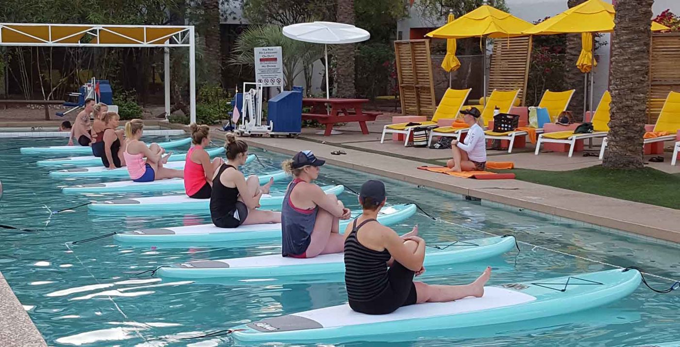 SUP yoga and SUP fitness are a fantastic way to take your practice to a new level. Classes are designed for all skill levels. Whether you have experience on a paddleboard, on a yoga mat, both, or none of the above, our instructors work with each participant to make modifications to keep it challenging and fun! Classes are hosted at local gyms and various resorts throughout the Phoenix area.