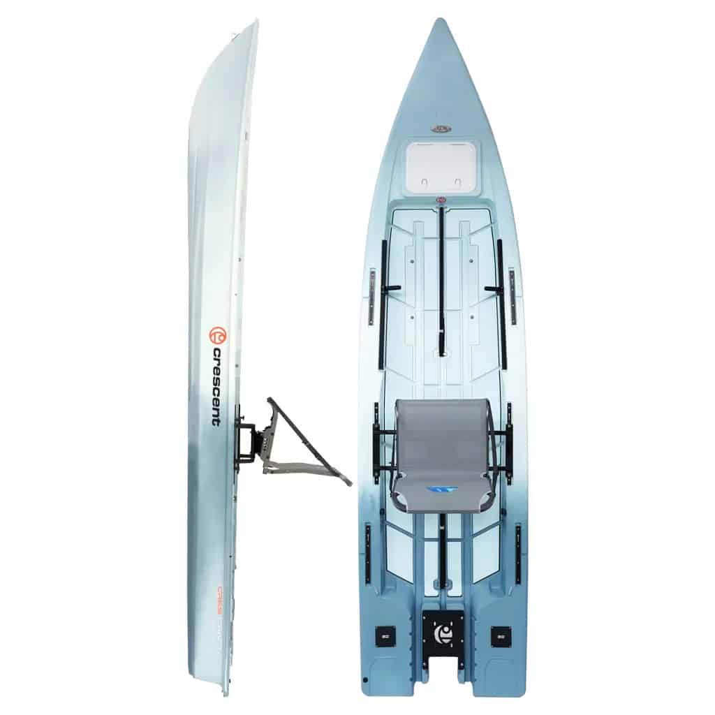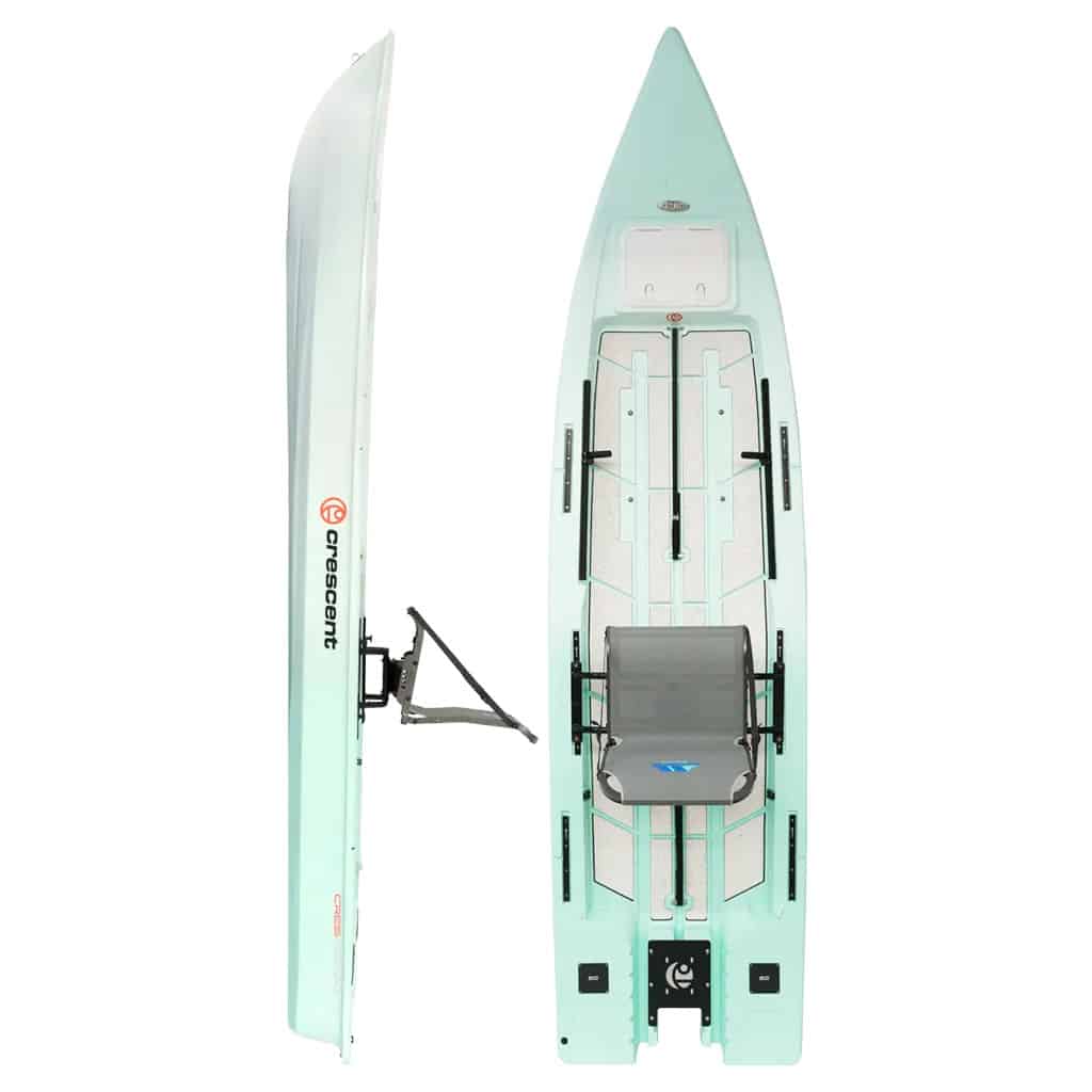 Crescent Kayaks Cres-Craft 13.6 power kayak micro-skiff in moonrock color, shown top and side view with elevated seat, open standing deck, and transom motor mount.