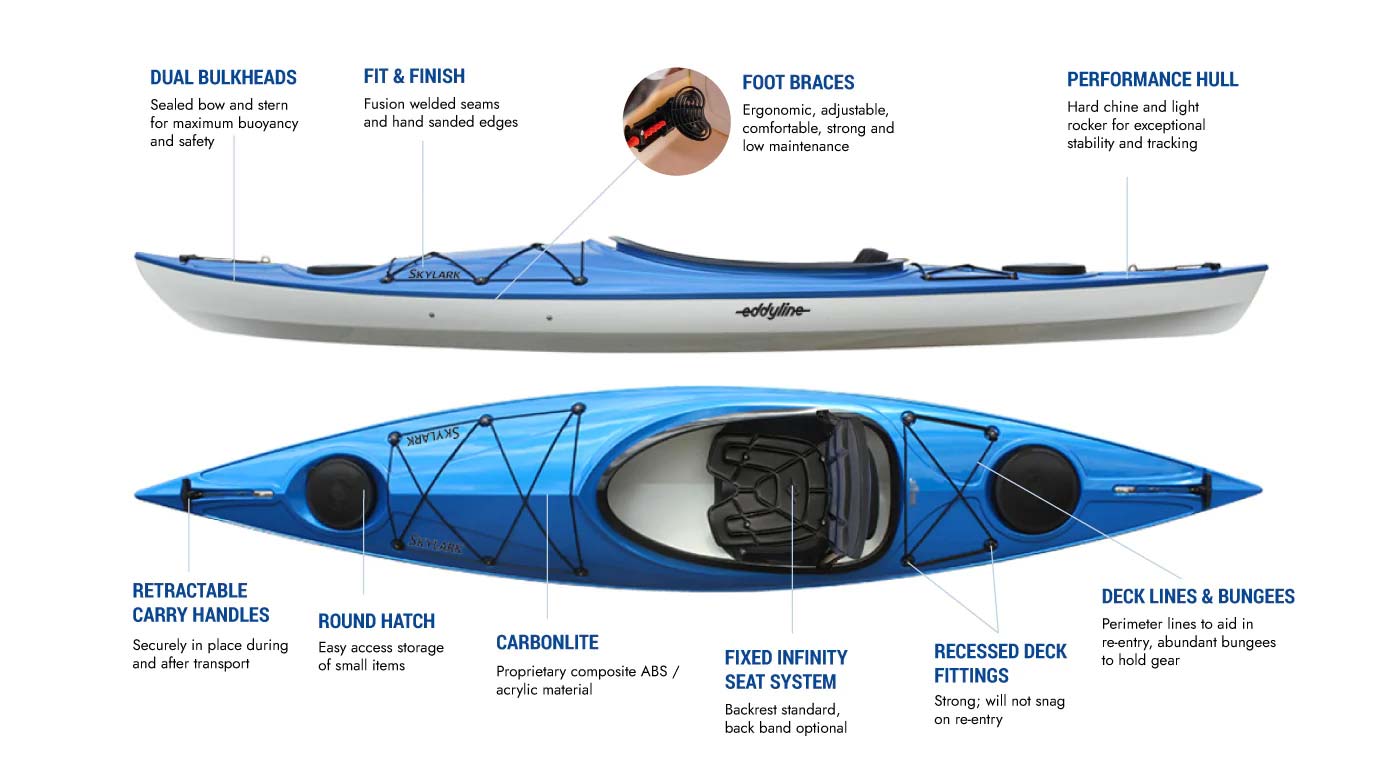 The 12-foot Skylark provides an abundant amount of room and stability while keeping the performance and efficient glide of longer boats. The storage hatches and sealed bulkheads bow and stern allow for safety and storage convenience. This versatile boat fits many paddlers and is easy to move both in and out of the water. The Skylark comes with a Backrest but the Backband is available as an option.