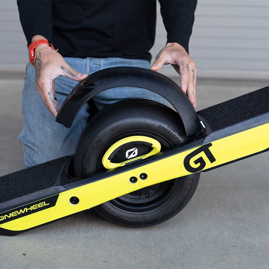 Introducing the OneWheel GT Hybrid Fender – taking Fender innovation to the next level. It offers the same coverage and protection as a standard fender, with the added feature of being convertible, akin to your favorite hard-top vehicle. Effortlessly detach the Hybrid Fender in seconds by simply engaging the anodized aluminum latch. To reattach, hook it onto the front locking ridge and snap it into place, again, in a matter of seconds. For a board designed to tackle any terrain, you deserve a fender that’s equally adaptable. Embrace the elements with the Onewheel Hybrid Fender.