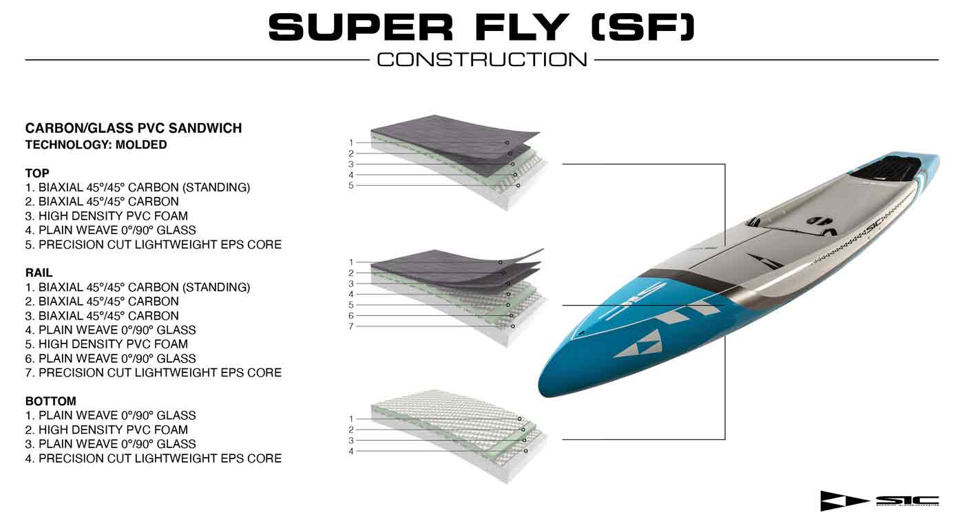 The Super Fly (SF) construction has been a massive leap forward in durability, stiffness and overall performance. With a full PVC wrapped core to give the board tremendous impact resistance with its tip-to-tail / 360-degree rail-to-rail wrap few boards can compare.