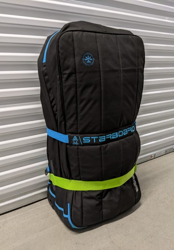 Starboards extra-strong board bag with roller wheels and carry straps, made from 18 – 23 recycled plastic bottles.