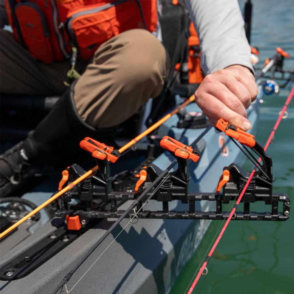 At the heart of the SideStage is the all-new ClickTrac Rail System, a revolutionary attachment system that allows for easy installation, adjustment, and removal of your accessories at the push of a button. This feature is especially beneficial for anglers using bow-mounted motors or pedal drives, as it offers a convenient way to keep three rods within reach, ensuring quick and easy access while on the water.