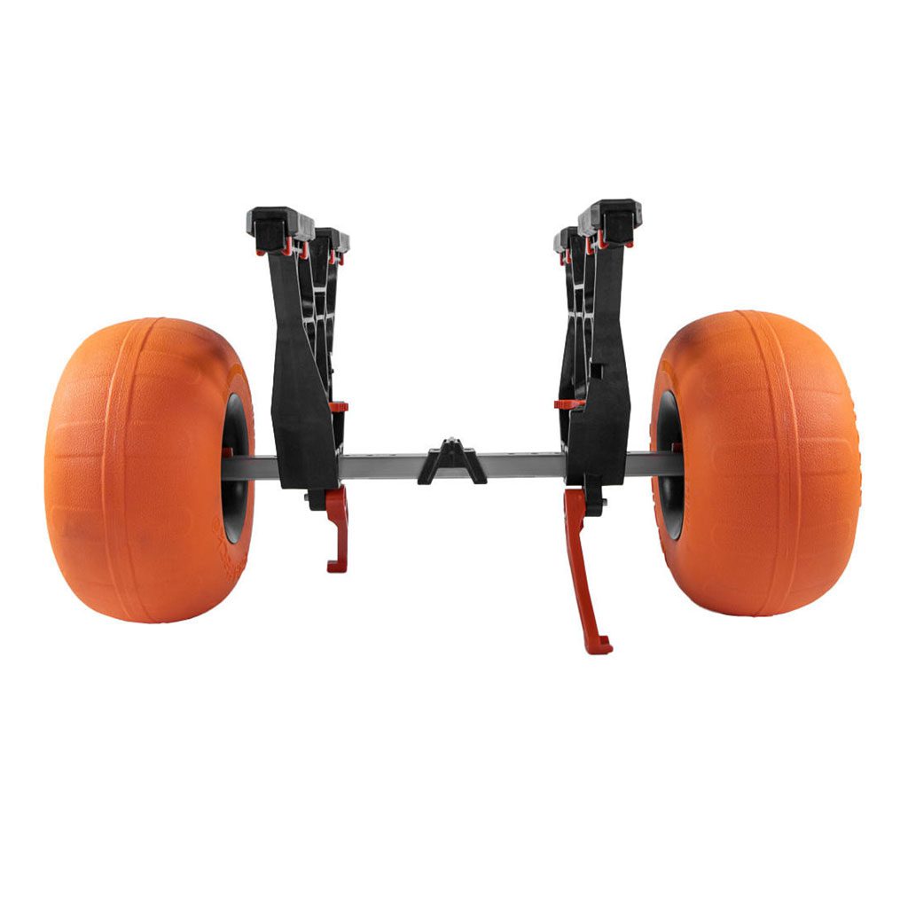 The cart comes with two air-filled balloon tires mounted on injection-molded two-piece wheels, optimized for soft surfaces like sand and mud. The wheels feature sealed hubs to keep out sand and grit, and they easily snap in place or remove with a push of a button, ensuring effortless assembly and disassembly.